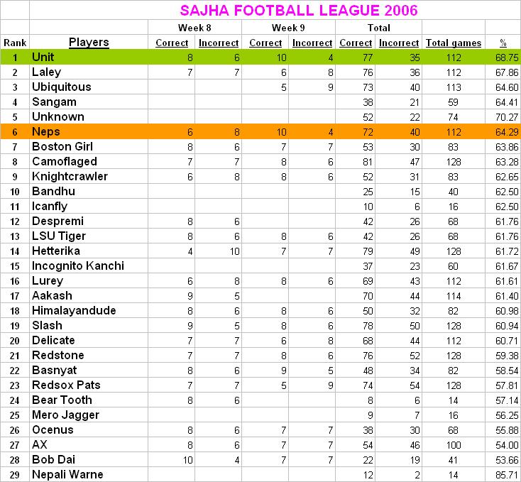 To Slash: Can you please do us a favor and post the NFL winners of the week when you post the result? There are so many posts a week, I whole heartedly believe that you got the counts right and never go back and check mine :-) So far, I have caught only one error! and didnt bother to check the rest. This is my suggestion and if enough sajha users agree, maybe you can post the teams that won the game for the week, and then post the sajha league scores? I just think it will be funr for all of us and easy for you too. Thanks!