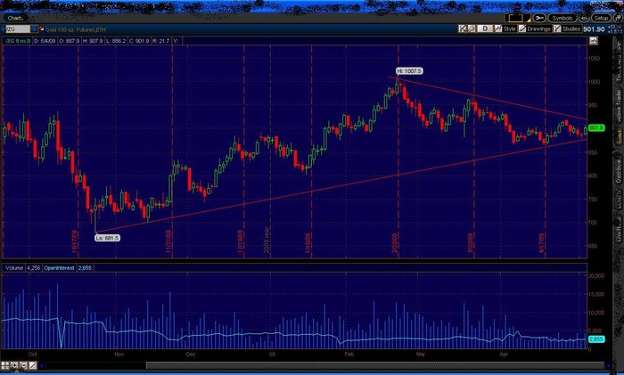emini - welcume back. and thanks for sharing some of your strategies/picks.. Personally i dont like this rally and i dont think rally has lot of potential beyond few months.. so i will advise people to stay away from C&H patterns.. for me the risk to reward ratio does not justify to be a Bull in a Bear Market. however... look at the 6 month gold chart shows a breakout is imminent from current trading range.