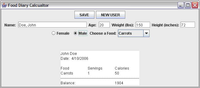 a food name, a serving size, and a number of calories. A text file is read which