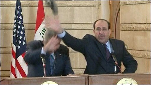 Iraqi journalist Muntadar al-Zeidi hurled a pair at Bush at a news conference in Baghdad on Dec. 14. Both shoes missed the president after he ducked. The journalist was jailed and is seeking a pardon from Prime Minister Nuri al-Maliki.