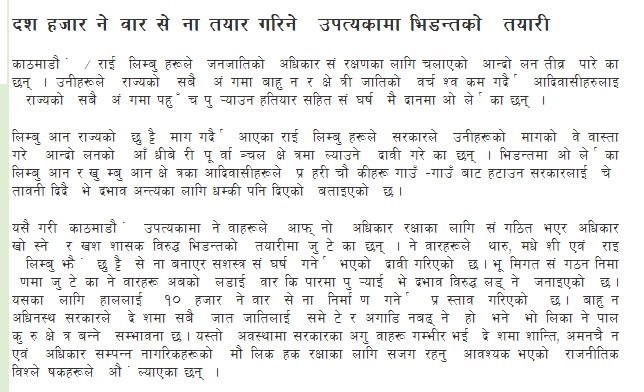 I don't think newars can come up with armed revolution. They never did in the history... they prefer eating CHHOLA to fighting war.. that's how they lost to PN Shah.. and now to Maoists.. Maoists are nicely screwing newars in the KTM with that 12- 18 hrs of load shedding. It's so dark that newars don'tr even know who is screwing them from behind.. What are these limbuwan gurungs and so on are talking.. They are the ones who were used by Maoists to kill 15,000 people... they cannot lead, they can only follow... so their struggle for separate region or whatever will not materialize as well.