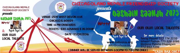 We are very glad to announce that CNFS is organizing Dashain Saanjh 2073 on October 9th, 2016, to preserve Nepali Culture and tradition and get together all of us around Chicagoland. This year we would be featuring RAJESH PAYAL RAI and local talents matched with popular songs and dance. You can buy your tickets down below: